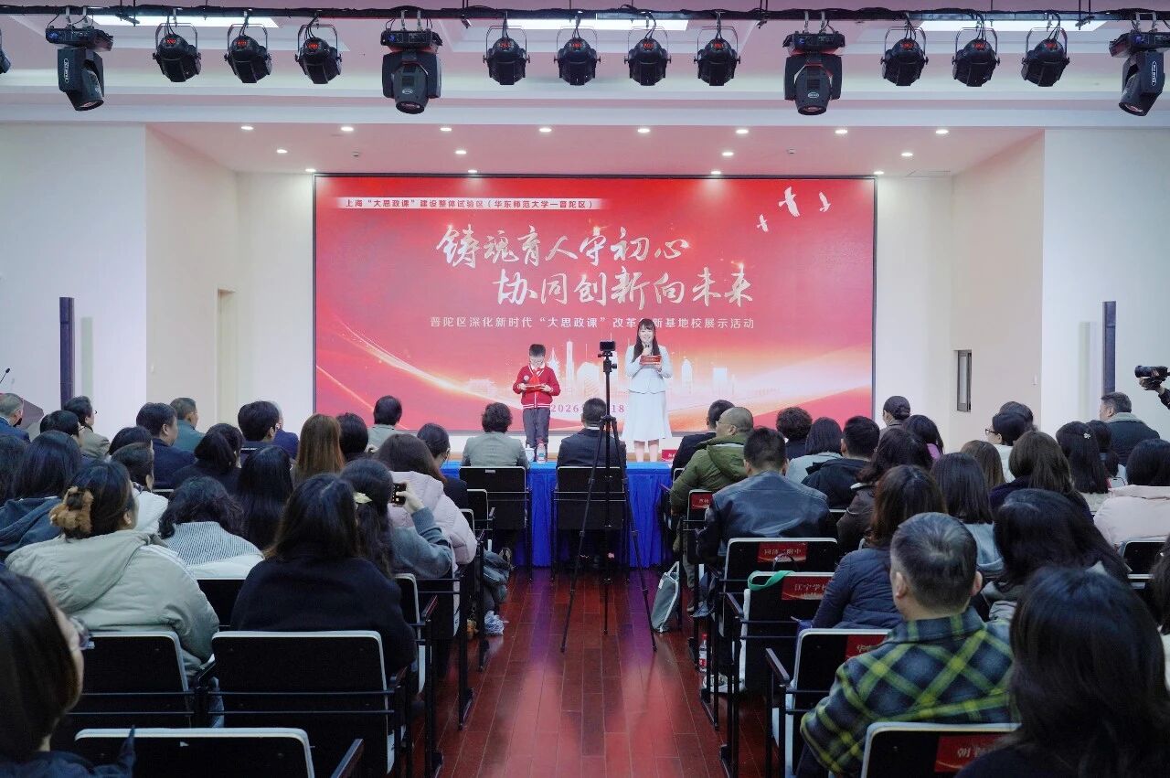副院长蒲妍作专家点评,充分肯定普陀区在“大思政课”建设中的实践成效与创新探索。 外场同步展出普陀区深化“大思政课”一体化建设阶段性成果,区域及20所基地校的红色研学课程、思政项目化学习案例、家校社协同育人模式等集中亮相,生动勾勒出“全域协同、全员参与、全程育人”的思政教育新格局。 下一步,普陀区将持续深化“大思政课”改革创新,擦亮“苏河思政”品牌,构建具有区域特色的思政育人新格局,为培养担当民族复兴大任的时代新人贡献普陀力量。